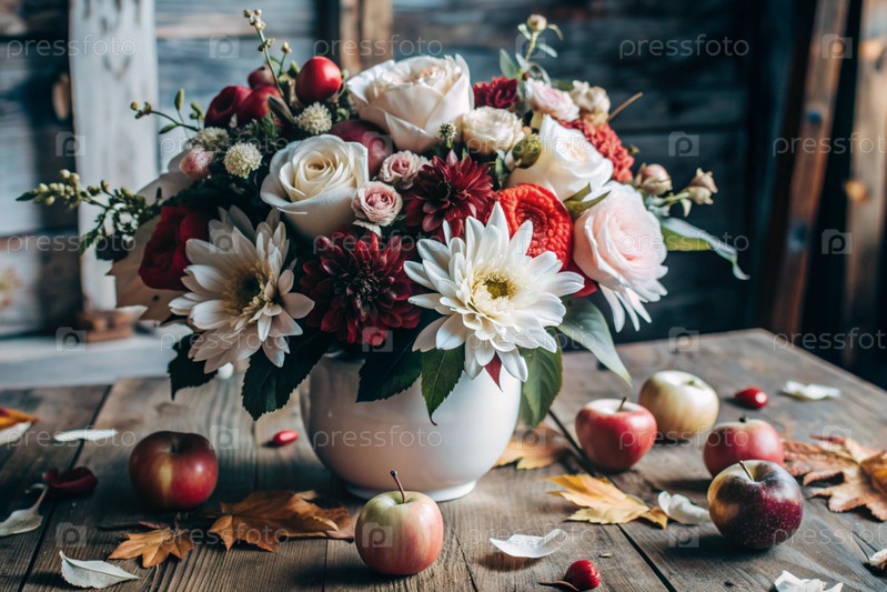 Красочное лето, осенний букет цветов различных красных, розовых, белых оттенков в вазе и спелые красные яблоки на столе