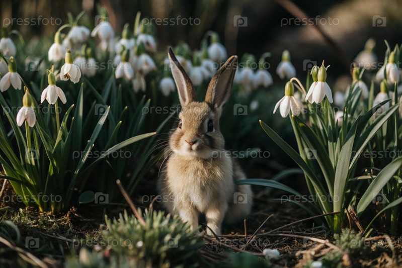 Баннер. пасхальный кролик в корзине из красочных пасхальных яиц вокруг весенних снегопадов и первичной розы. концепция праздника Пасхи