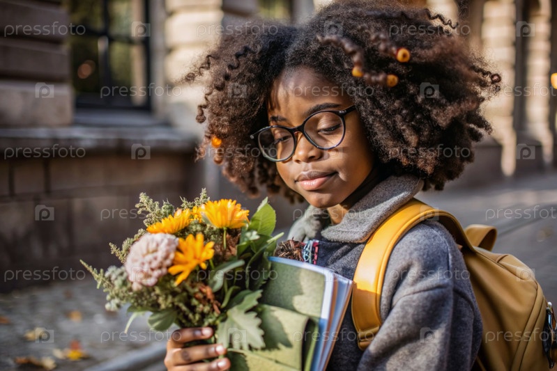 Красивая афроамериканка на очках с букетом осенних цветов впервые идет в школу. Ребенок со школьной сумкой, книгой и цветами. Малыш на городской улице