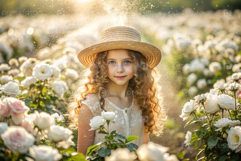 Портрет красивой кудрявой девушки в соломенной шляпе и платье в цветущем розовом саду. Детство. Девочка позирует и смотрит в камеру