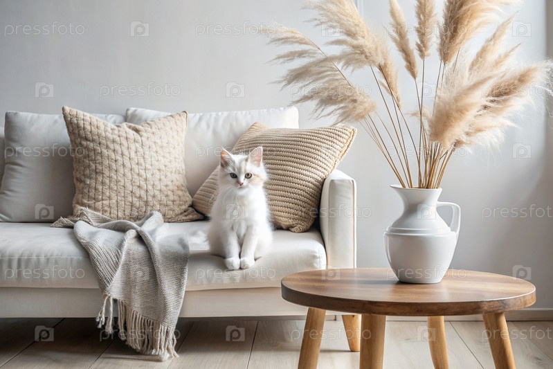 Белый пушистый котенок в современном скандинавском стиле интерьера