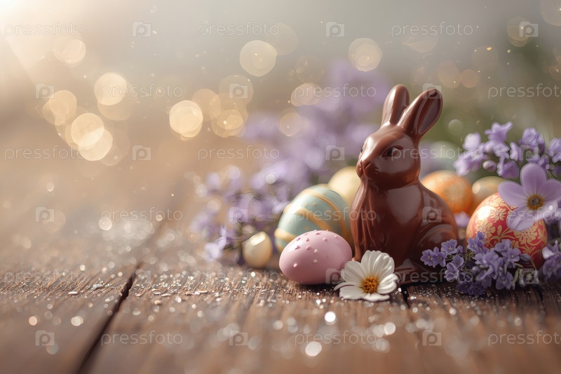 Пасхальные сладости и лакомства. Концепция ярких пасхальных праздников в 2026 году. Хорошая открытка. Баннер. Шоколадные пасхальные яйца, шоколадный кролик и весенние цветы на деревянном фоне