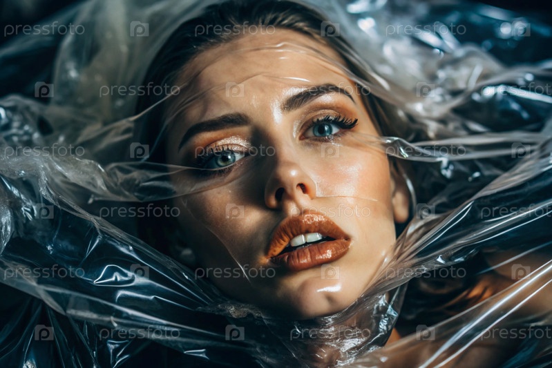 Девочка завернута в целлофан или сумку. Девушка задыхается. Пластиковое загрязнение планеты. Опасность для окружающей среды. Сокращение повторного использования пластика. Переработка. Концепция мусора