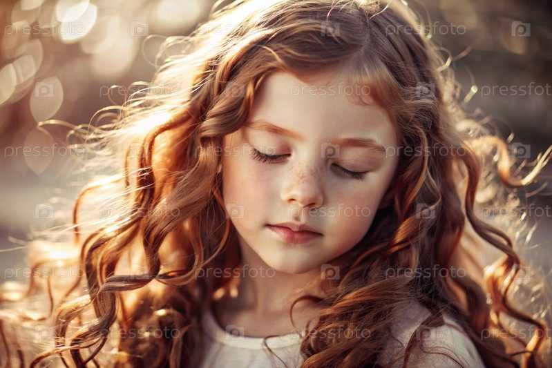 Портрет красивой маленькой рыжеволосой девочки с длинными волнистыми волосами и задумчивым взглядом.Власы развиваются и создают ощущение легкости и естественности