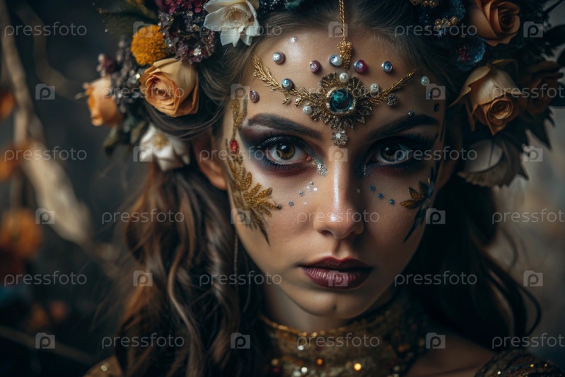 Портрет женщины с красивым макияжем, блестящими элементами, рисунками на лице и цветами в волосах