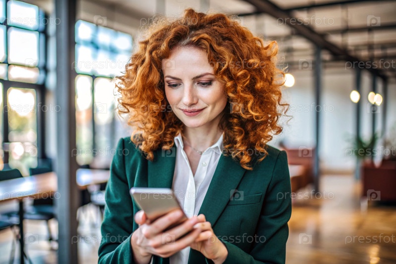 Деловая женщина с локонами красных волос и веснушками. Она одета в обычное зеленое пиджак. В руках смартфон. Небольшой бизнесмен смотрит на свой мобильный телефон