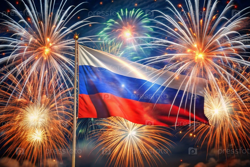 Россия. Москва. Национальный флаг Российской Федерации на фоне фейерверков. Русский триколор. День России отмечается 12 июня