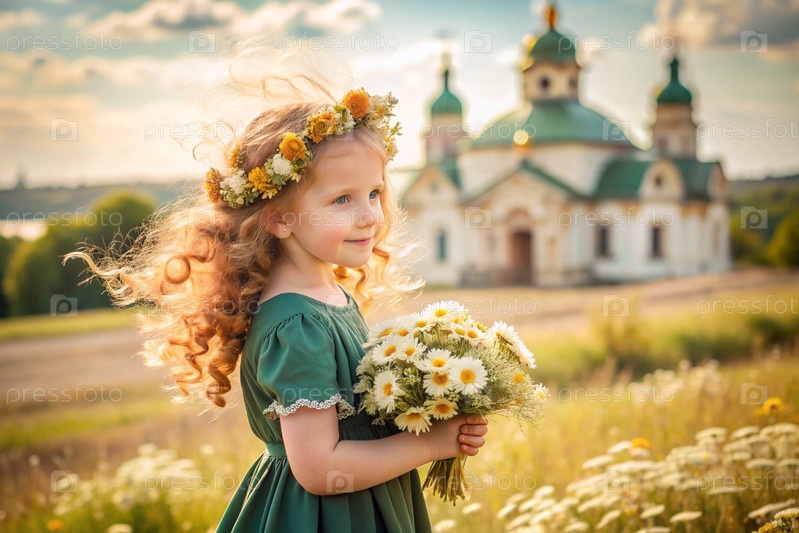 Всероссийский День семьи, любви и верности Красивая маленькая кудрявая девочка с букетом ромашек на фоне Православной церкви День святого Валентина Петра и Февронии