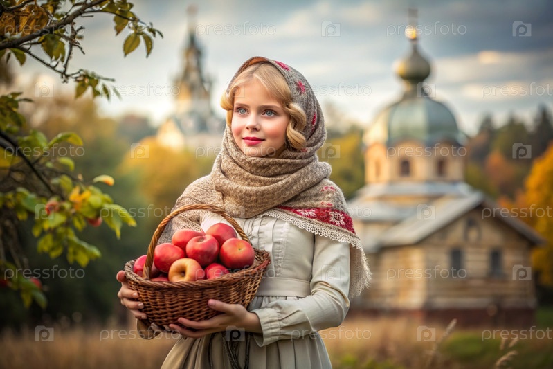 Концепция русского православного праздника Apple resort. Красивая девочка в российской национальной одежде и шарф с корзиной спелых красных яблок на фоне Православной церкви