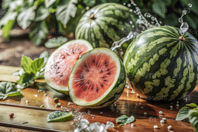 Закрытие свежих ягод арбуза. Вкусные ягоды и фрукты ярко-красного цвета с капельками воды. Вегетарианство. Здоровое питание. Свежие плоды на столе