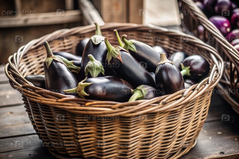 Концепция выращивания продуктов питания. свежие органические баклажаны на фермерском рынке. богатый урожай баклажан в плетеновой корзине