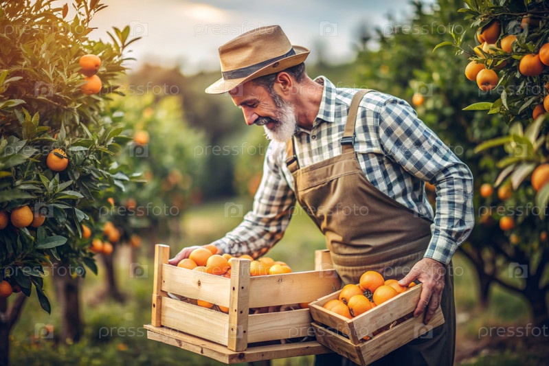 Сельскохозяйственная промышленность. Деревянный ящик с апельсинами в руках фермера-мужчины. Садовник собирает богатый урожай. Ближе, солнечный свет. Осенний сбор фруктов