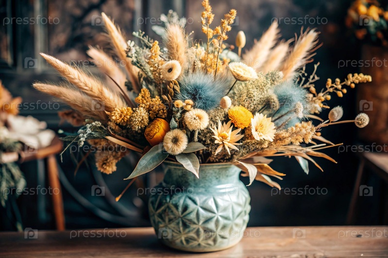 Красивый букет сушеных цветов в керамической вазе на древнем деревянном шкафу. Букет цветов в вазе во внутренней части дома. Светлый, бежевый, синий цветочный фон