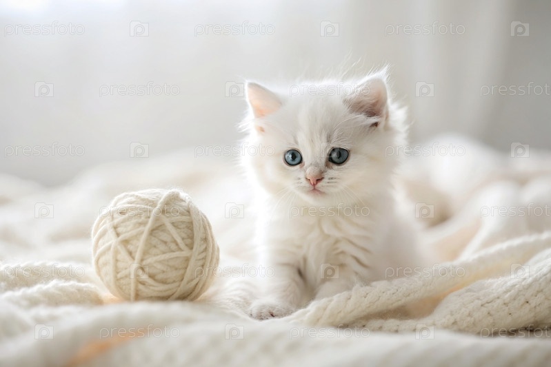 Животные. маленький пушистый белый котенок играет с шариком пряжи на белой кровати. любопытный кот лежит на белом одеяле и смотрит в камеру. текстиль, вязание