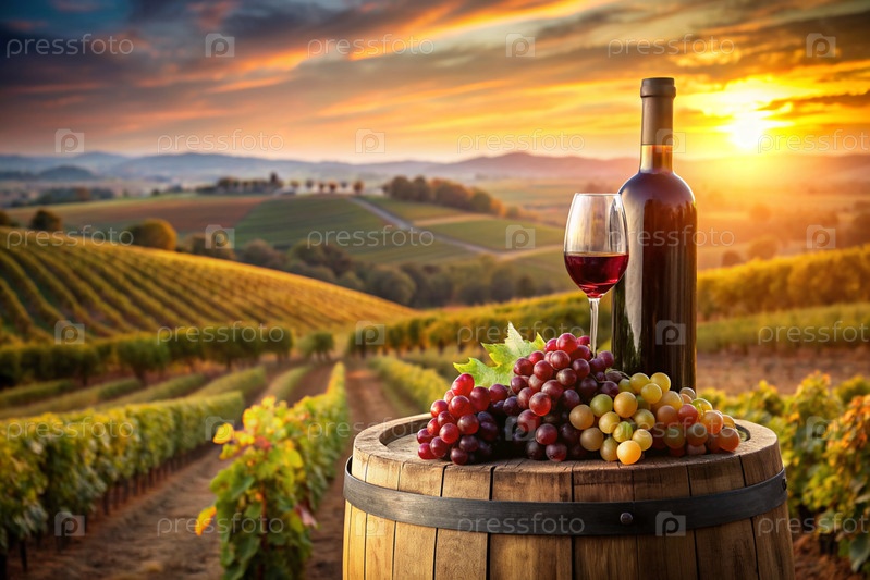 Бутылка красного вина и куча спелых виноград на деревянной дубовой бочке на фоне виноградника