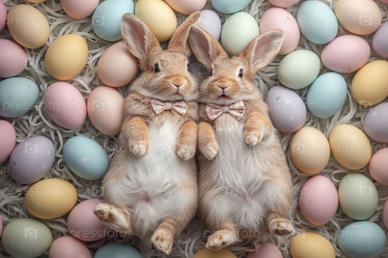 Пасхальные кролики лежат на пасхальных яйцах и смотрят в камеру