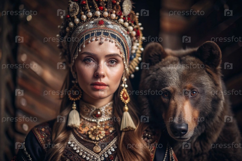 Красивая девушка в традиционном русском национальном костюме.Перед живым медведем.Портрет символизирует традиции и красоту русского народа