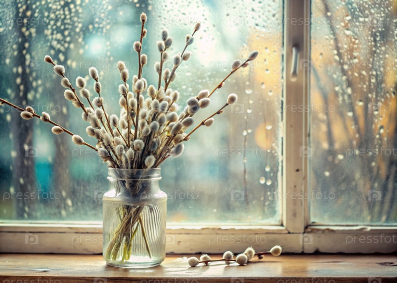 Большой план букета ивы в стеклянной вазе на фоне старого белого окна с капельками дождя на стекле