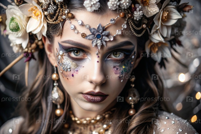 Портрет женщины с красивым макияжем, блестящими элементами, рисунками на лице и цветами в волосах