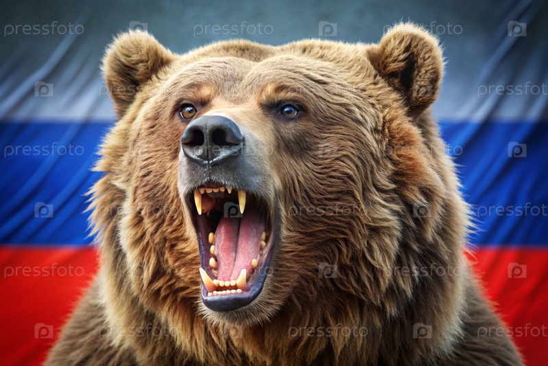 Злой, рычащий медведь на фоне российского флага. Трицветный. Не будите русского медведя