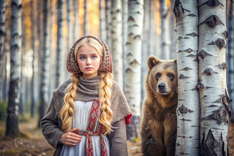 Красивая маленькая девочка в русской народной одежде и с платками на голове в березовой роще с живым медведем Русский фольклор, славянская мифология
