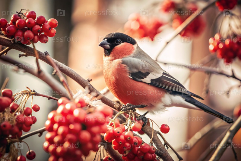 Милая красочная евразийская бульфинга, сидящая на ветке и питающаяся ягодами красного пепла