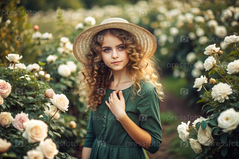 Портрет красивой кудрявой девушки в соломенной шляпе и платье в цветущем розовом саду. Детство. Девочка позирует и смотрит в камеру