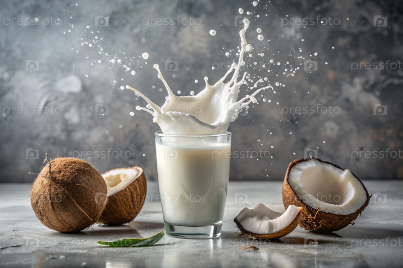 стакан кокосового молока и кокосов с щелчками молока на сером фоне. веганское кокосовое молоко - это немолочное или безмолочное молоко. здоровая веганская еда