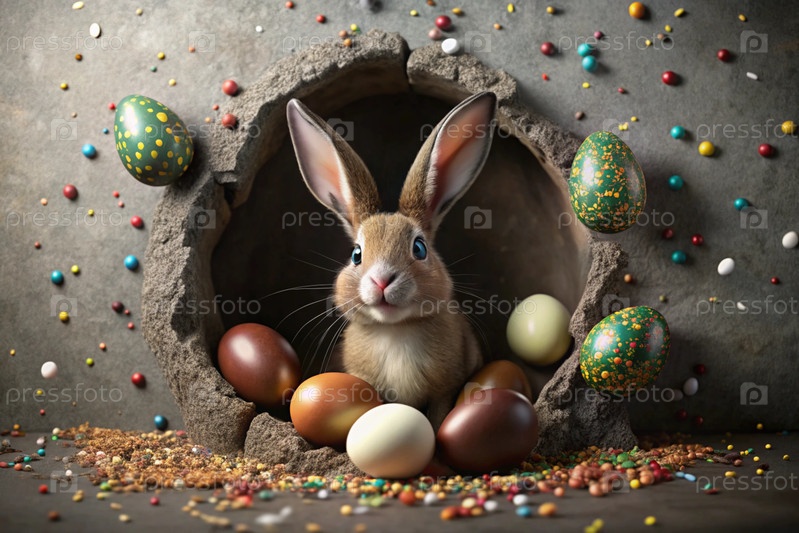 Известный праздник. милый пасхальный кролик заглядывает из ямы с красочными яйцами вокруг. концепция счастливой Пасхи