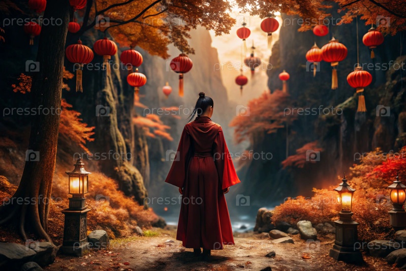 Японская девушка в традиционном национальном костюме - кимоно. На сказочном фоне фонарики и осенние деревья. Портрет символизирует традиции и культуру народа Японии