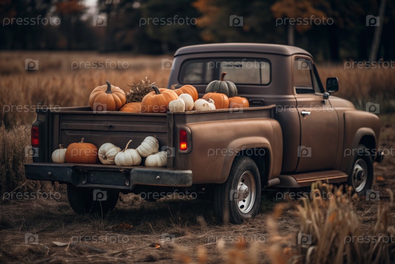Осень, осенний дизайн.Большой урожай тыквы на заднем сиденье ретро-пикапа, крупный план