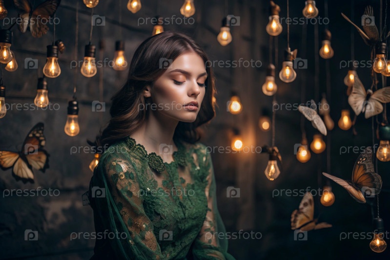 Портрет красивой девушки в зеленом платье среди многих подвешенных лампочек и бабочек, размахивающих вокруг нее