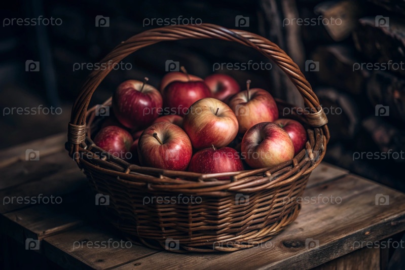 Корзина из косточки, полная свежих фруктов. корзина с красными яблоками. красивое солнечное сияние. осенний урожай, урожай или уборка