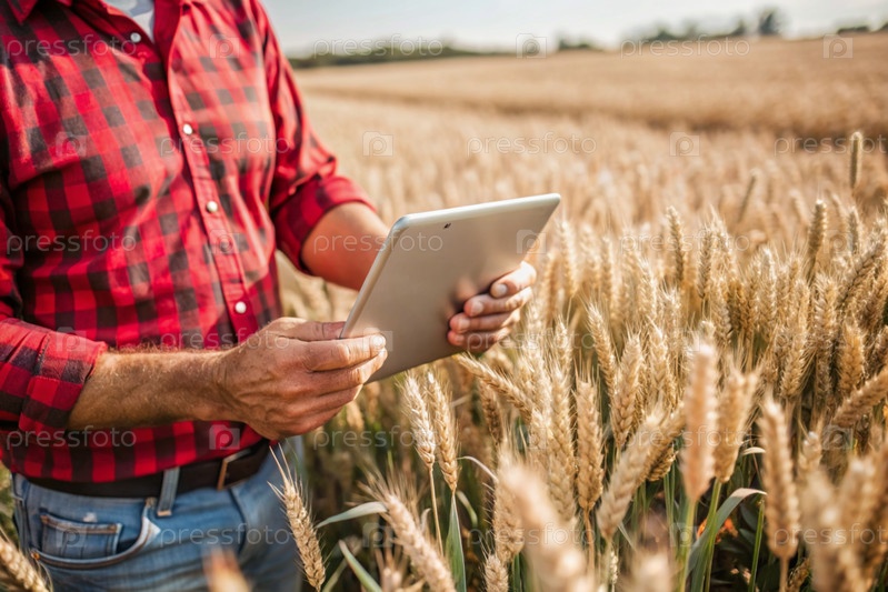 Agronom использует программное обеспечение для обработки онлайн-данных для цифрового сельского хозяйства.Фермер с планшетом в руках стоит на пшеничном поле
