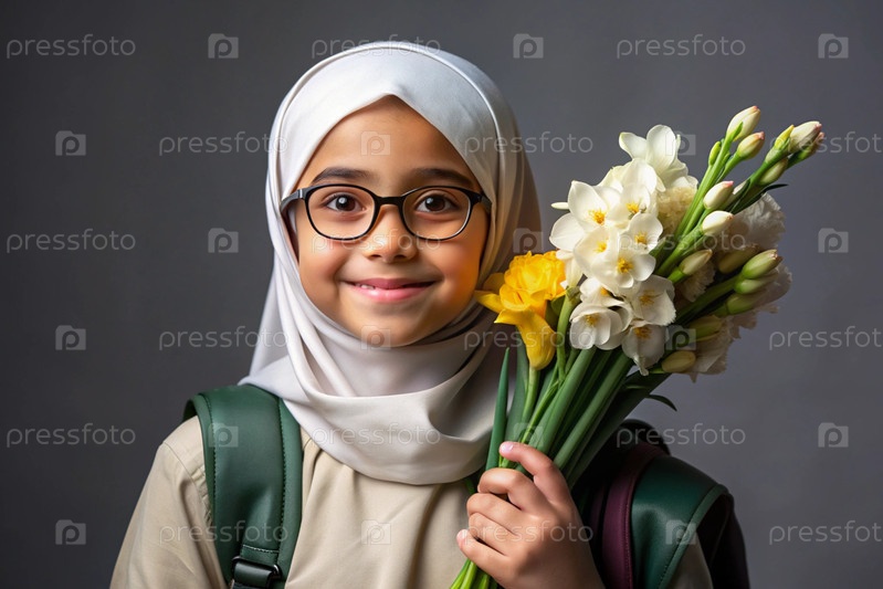 Первоклассник-мусульманин с очками на доске. Девушка держит цветы в руках. Ребенок пойдет в школу впервые. Ребёнок с рюкзаком, книгой и цветами. Возвращение к школе
