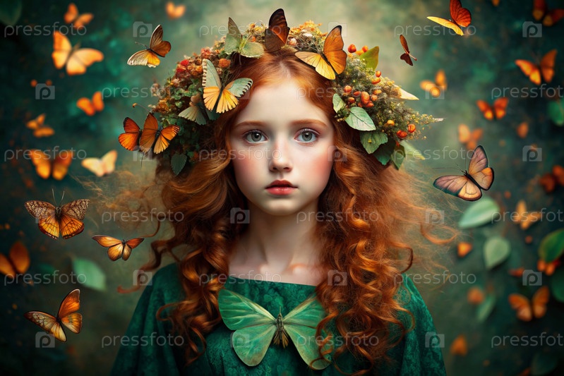 Портрет красивой рыжеволосой девушки в зеленом платье с бабочками, летящими вокруг ее головы и волос
