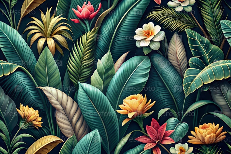 Иллюстрация.Фон тропических листьев, пальмовых листьев и тропических цветов.Прекрасный абстрактный фон для баннера