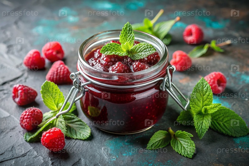 Банка домашней малины, здоровый варенье с мятой на черном фоне.Сохранение и уборка летом