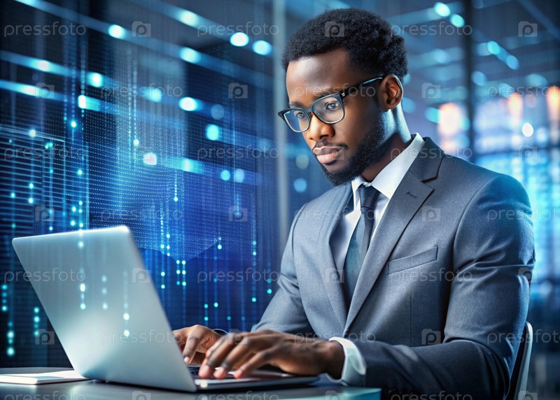 Молодой чернокожий мужчина, афроамериканец в костюме, работает в офисе за ноутбуком с цифровыми кодами на виртуальном экране
