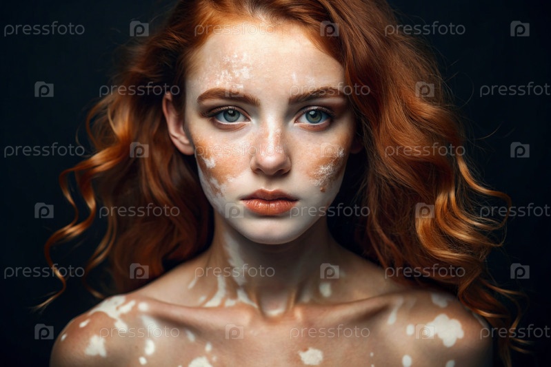 Лейкодермия. Витилиго. Плохая пигментация кожи. Большие белые пятна по всему телу и лицу. Портрет красивой девушки с кожными заболеваниями