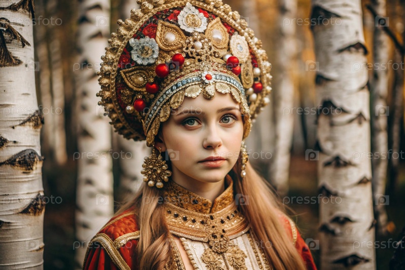 Красивая девушка в традиционном русском национальном костюме.Перед березовым ростом.Портрет символизирует традиции и красоту русского народа
