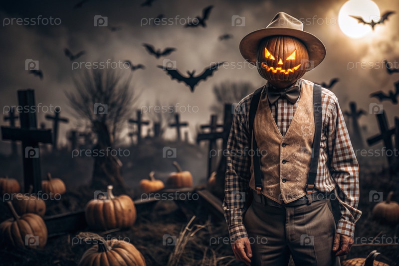 Концепция Хэллоуина. Ужасная. Страх. Устрашающий богий с тыквенной головой, квадратной рубашкой и бабочкой. Баннер, открытка