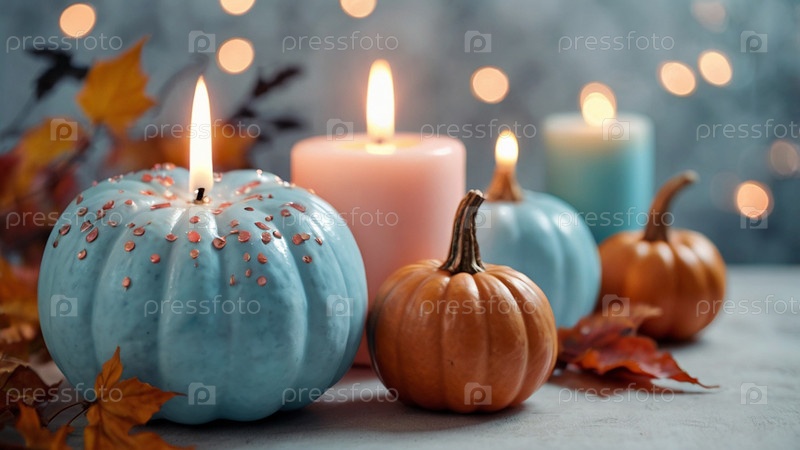 Пастельный розовый и синий тыквенные цвета, светло-синие и розовые свечи и осенние листья на светлом фоне