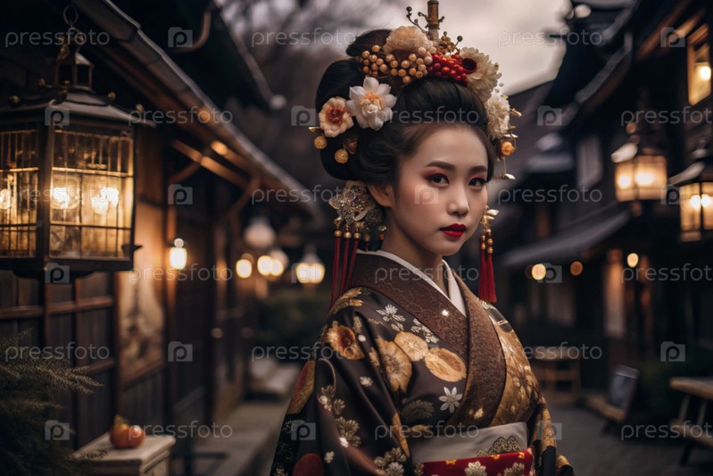 Японская девушка в традиционном национальном костюме - кимоно. На фоне домов, фонарей и вишневых деревьев портрет символизирует традиции и культуру народа Японии