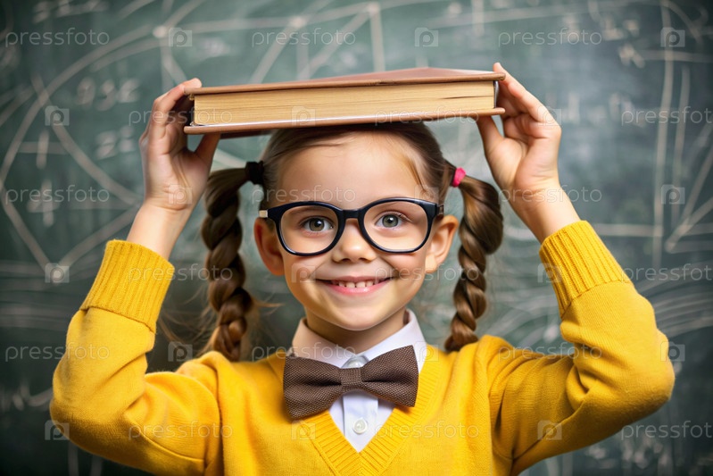 Красивая девушка с очками и книгами на голове. Ребенок впервые идет в школу. Ребёнок в классе со доской на заднем плане. Возвращение к школе