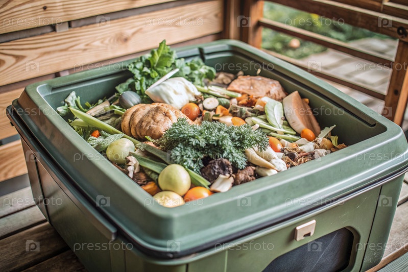 Открытый контейнер для компоста с кожурой и фруктовыми и овощными обрезками.Органические отходы в садовом компостере.Экологическое садоводство, устойчивость, экология