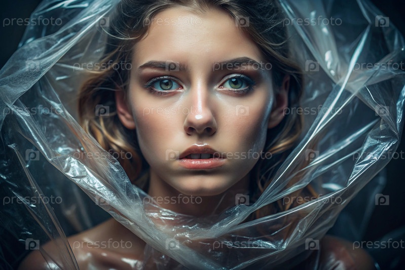 Девочка завернута в целлофан или сумку. Девушка задыхается. Пластиковое загрязнение планеты. Опасность для окружающей среды. Сокращение повторного использования пластика. Переработка. Концепция мусора