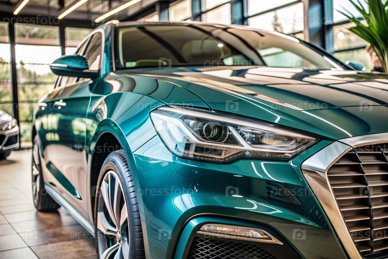 Офис современного автосалона. Бизнес-концепция продаж и аренды автомобилей. Новый автомобиль припаркован в современном автосалоне. Концепция автолизинга и страхования. Электрическое транспортное средство