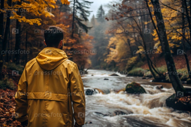 Человек в желтом резиновом плаще против огромной реки в горном лесу. он путешествует и наслаждается жизнью и окружающей средой. туризм