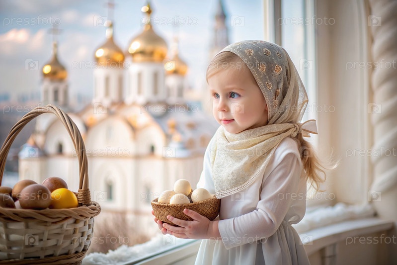 Счастливая Пасха. Христианство. Портрет трехлетней девочки в русском народном платье и шалах с корзиной из плети с пасхальными яйцами в руках на фоне православной церкви